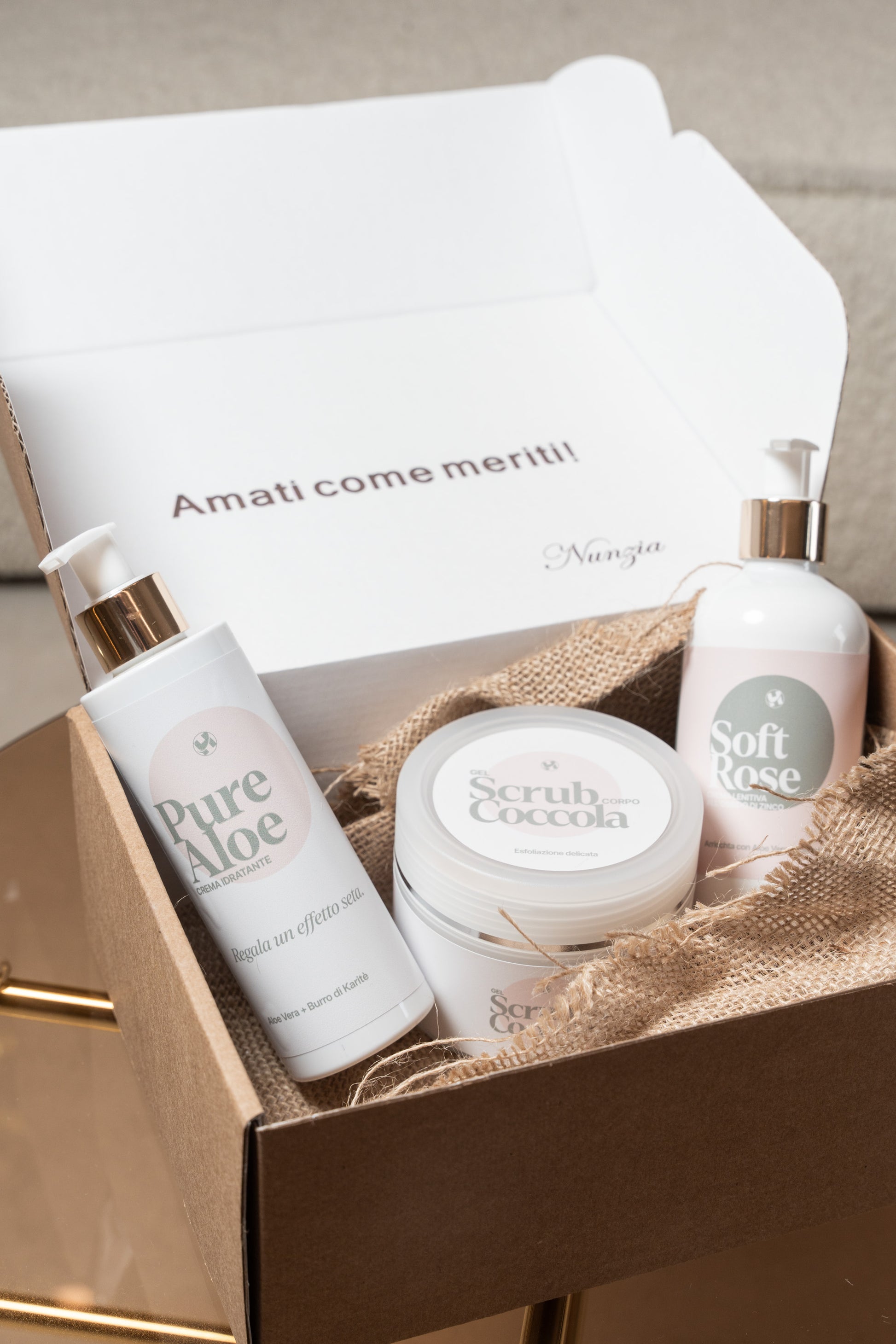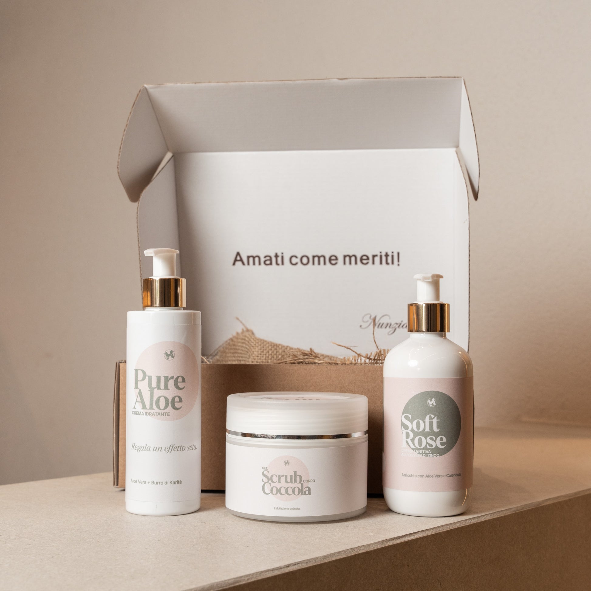 La Box TotalBody Complete, composta dalla crema PureAloe, Gel Scrub Coccola ,e dalla crema SoftRose, è studiata per offrire un trattamento completo e rigenerante della pelle.